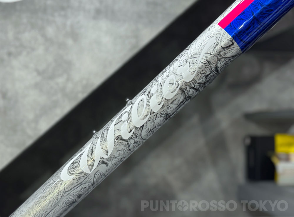 大理石のようなMarble Effect Paint(ラップ塗装)を施したシルバーと濃青のベースに、ホワイトのロゴと蛍光ピンクのラインを配したデザインです。
